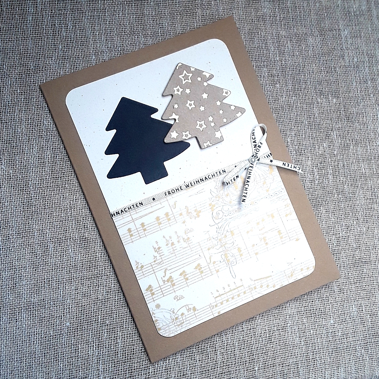 braune Karte, Tannenbäume schwarz/goldene Sterne und unten Notenpapier gold (Bild 3)