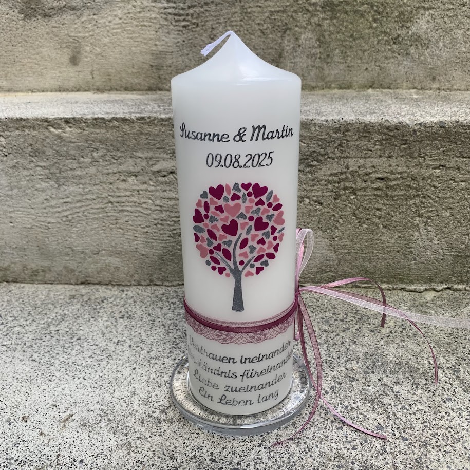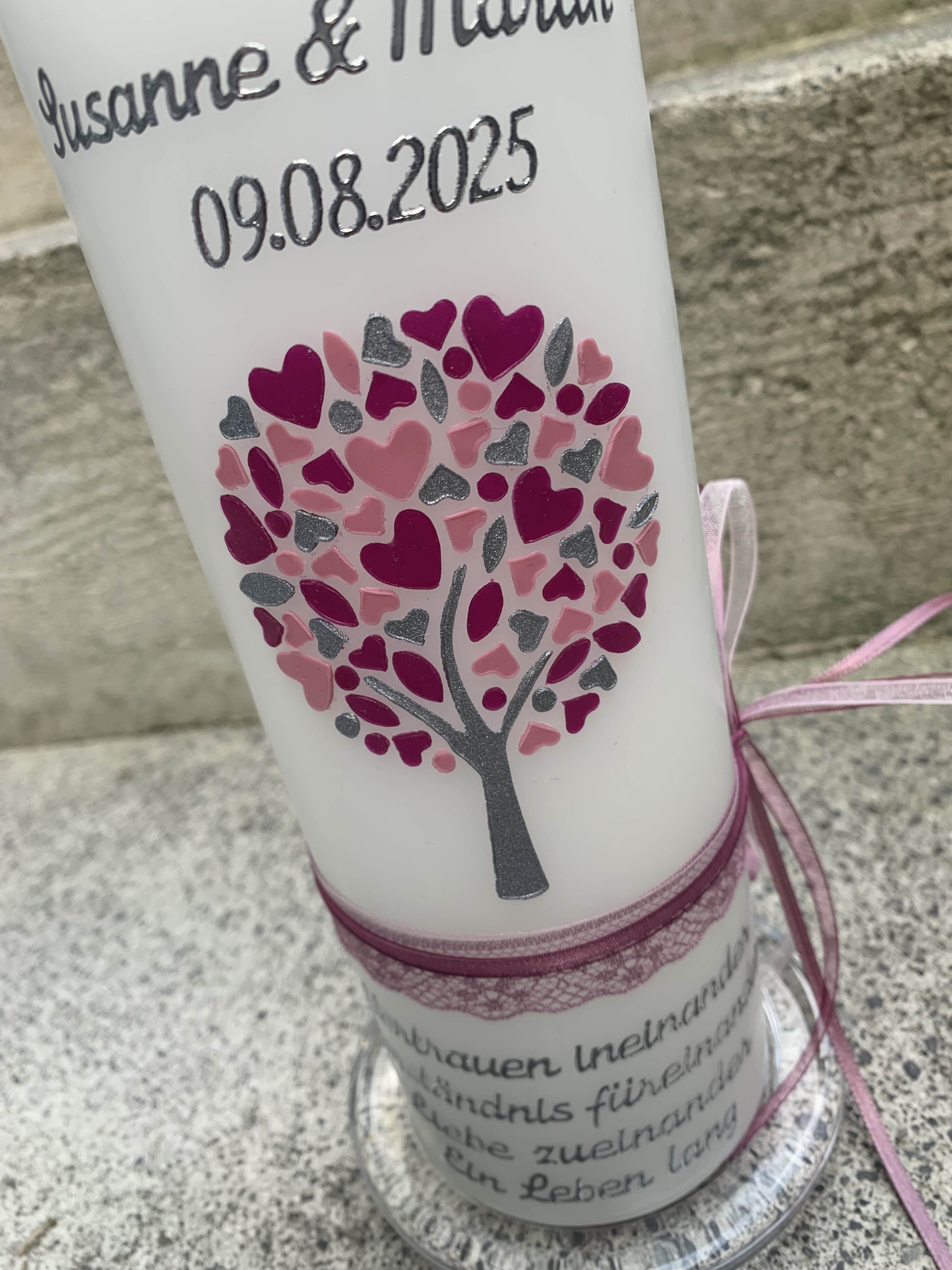 Die Kerze kann man auch ohne einen Spruch haben, da könnte man dann die Namen oben machen und das Datum unten wo der Spruch ist, oder beider unten.
