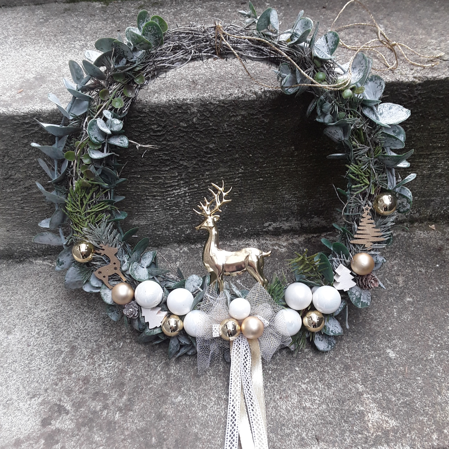 Schleife in Gold/weiß, der Kranz wird mit der goldenen Kordel aufgehängt.